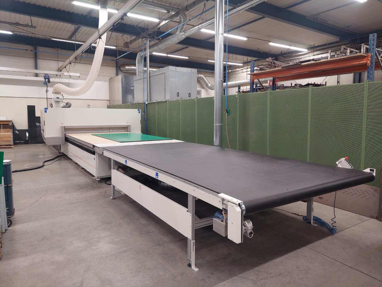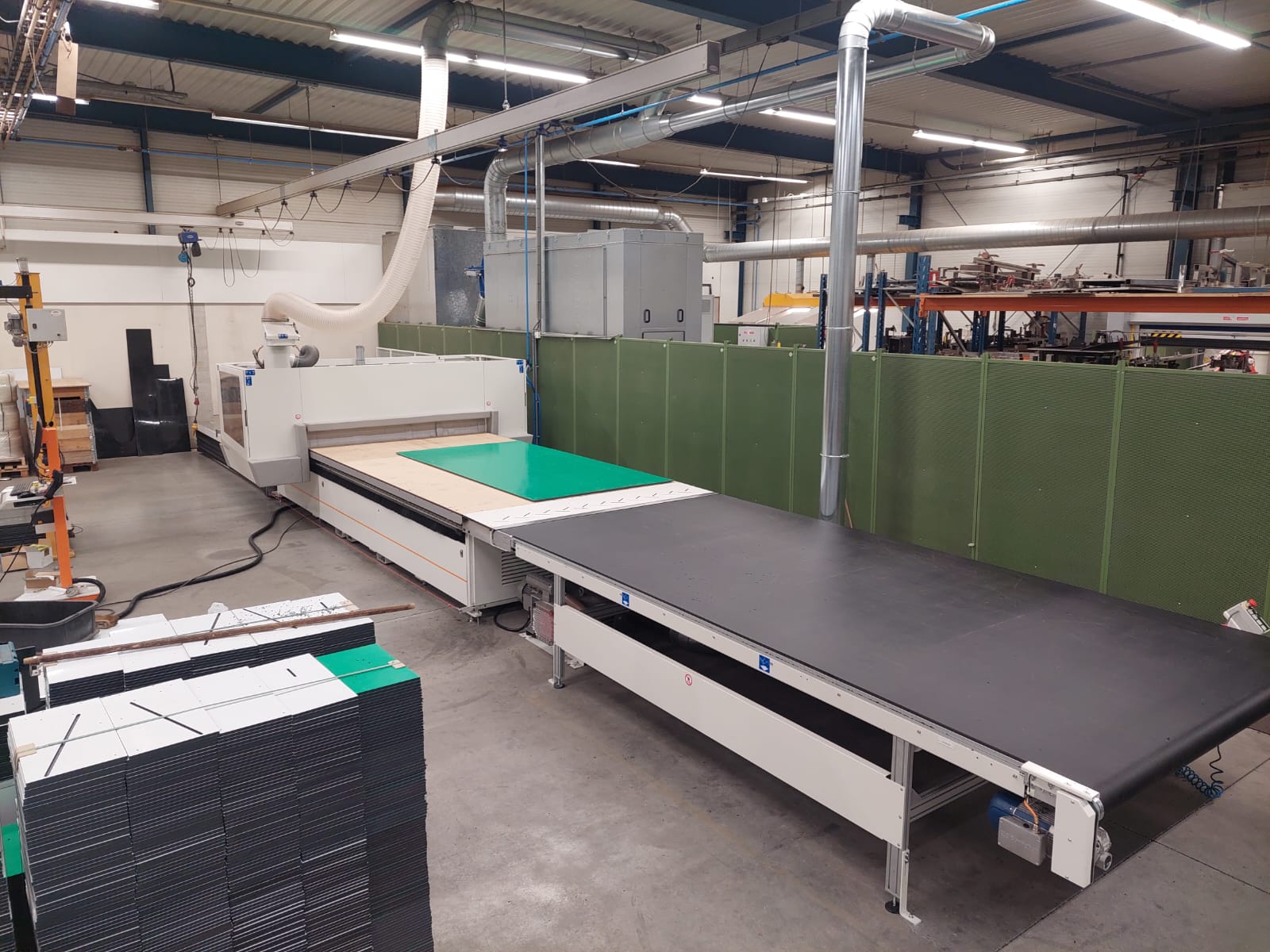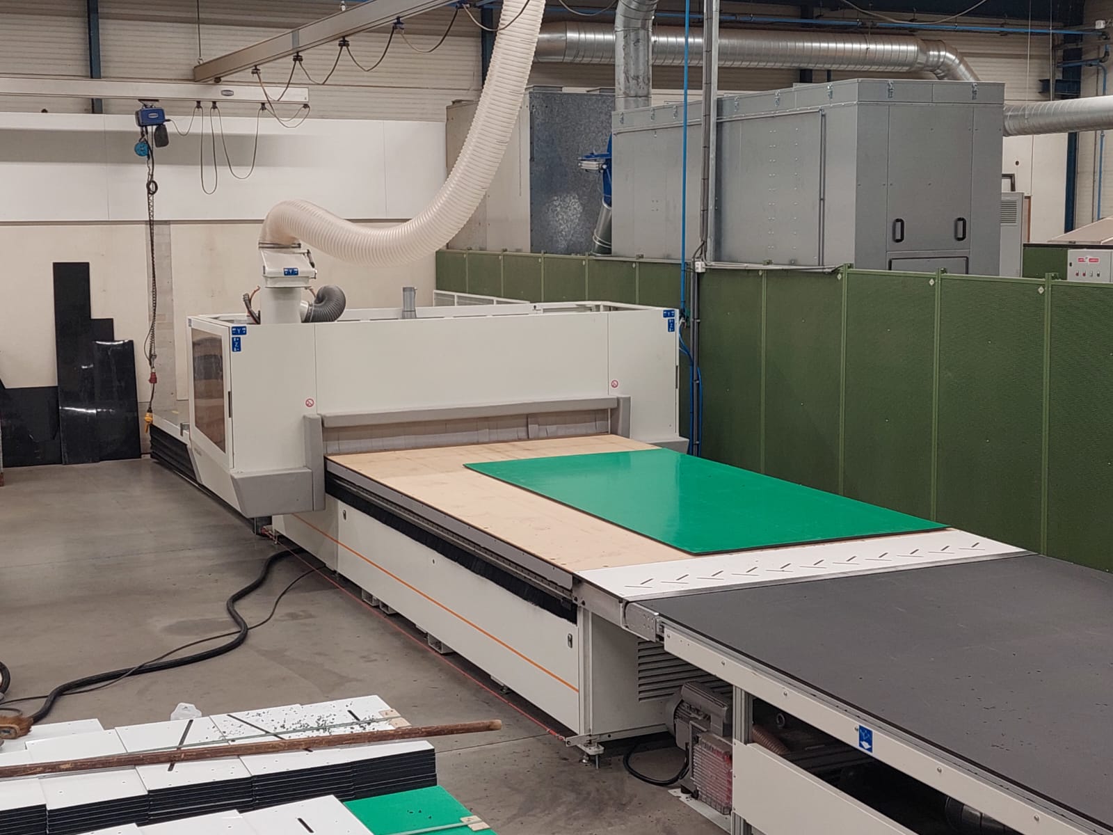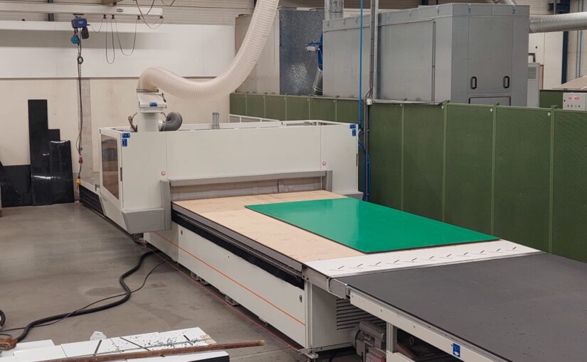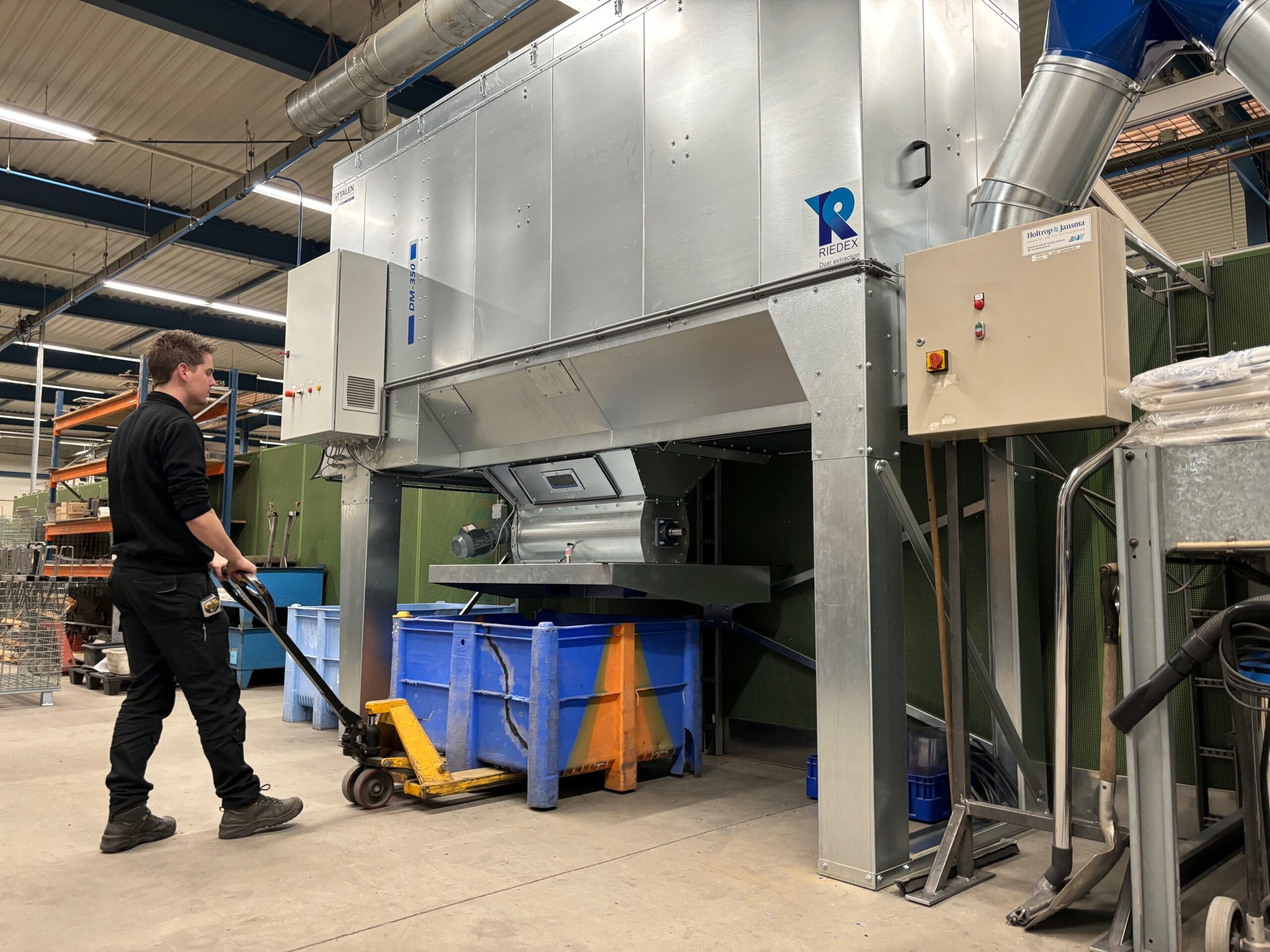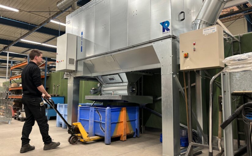 De CNC-nestinglijn wordt afgezogen met een Riedex DM350. De afzuigunit is voorzien van luchtsluis met materiaal opvang in de maatbakken van de klant. Het niveau van de bak wordt gemeten met een sensor en wanneer nodig gemeld aan de operator bij de machine, met terugkoppeling op de CNC-nestinglijn. Deze volle bakken worden weer ingeleverd bij het kunststof recycling punt.
