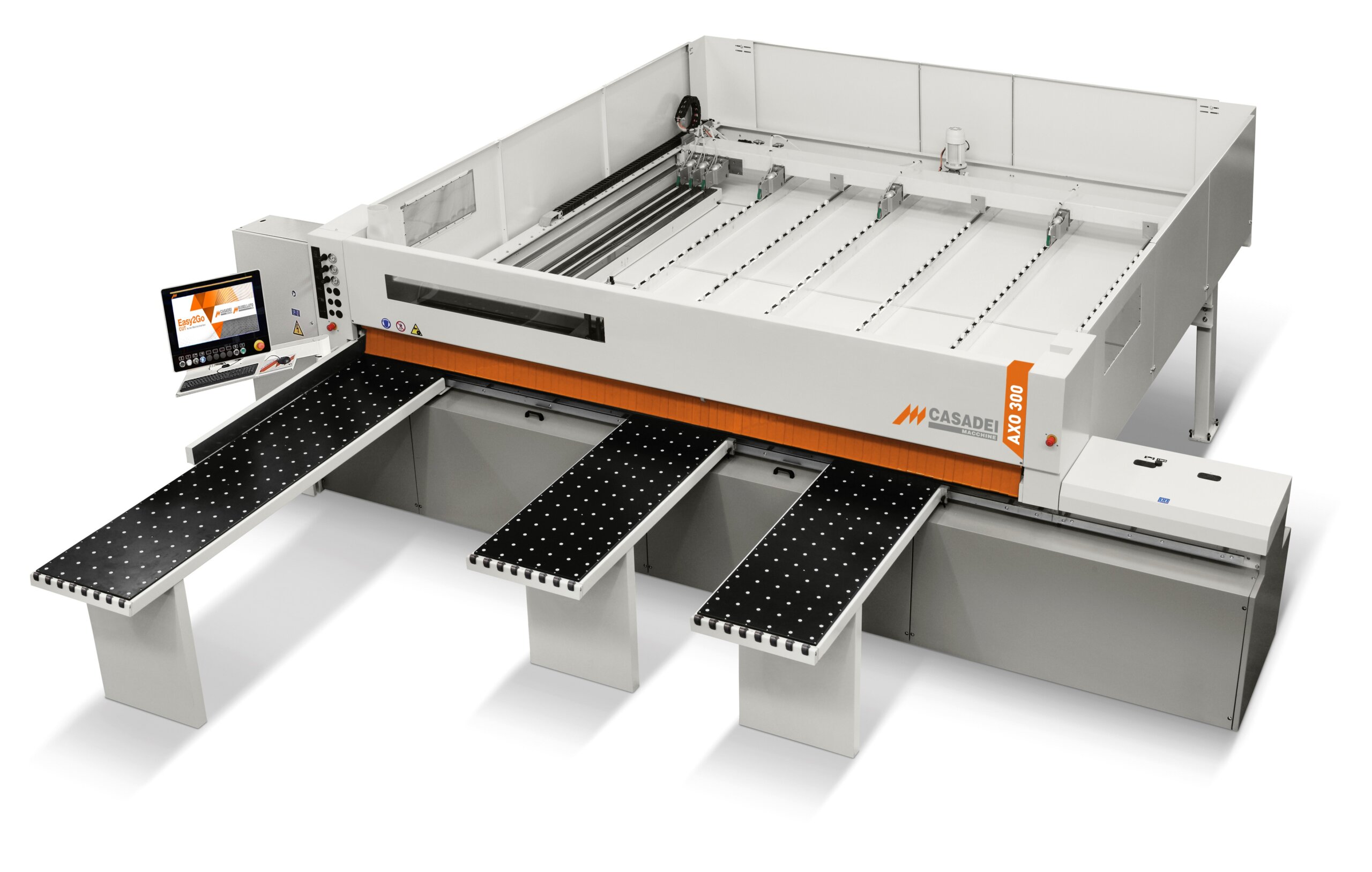 Opdeelzaag met voorrits. Kan dieper zagen dan de AXO 200, is sneller en heeft een groter zaagblad. De zaag beweegt zich met een snelheid van maximaal 60 m/min. Machine is verschillende groottes en met verschillende snelheden te krijgen.
