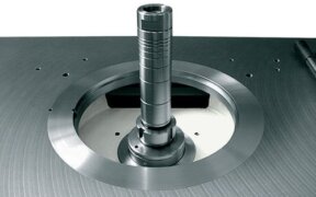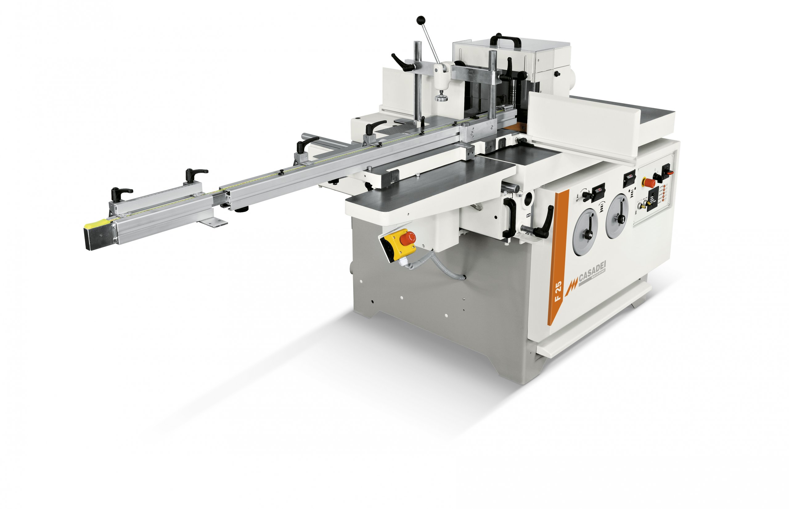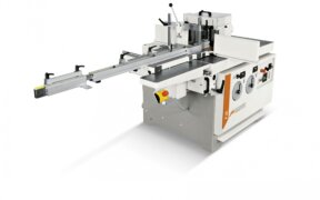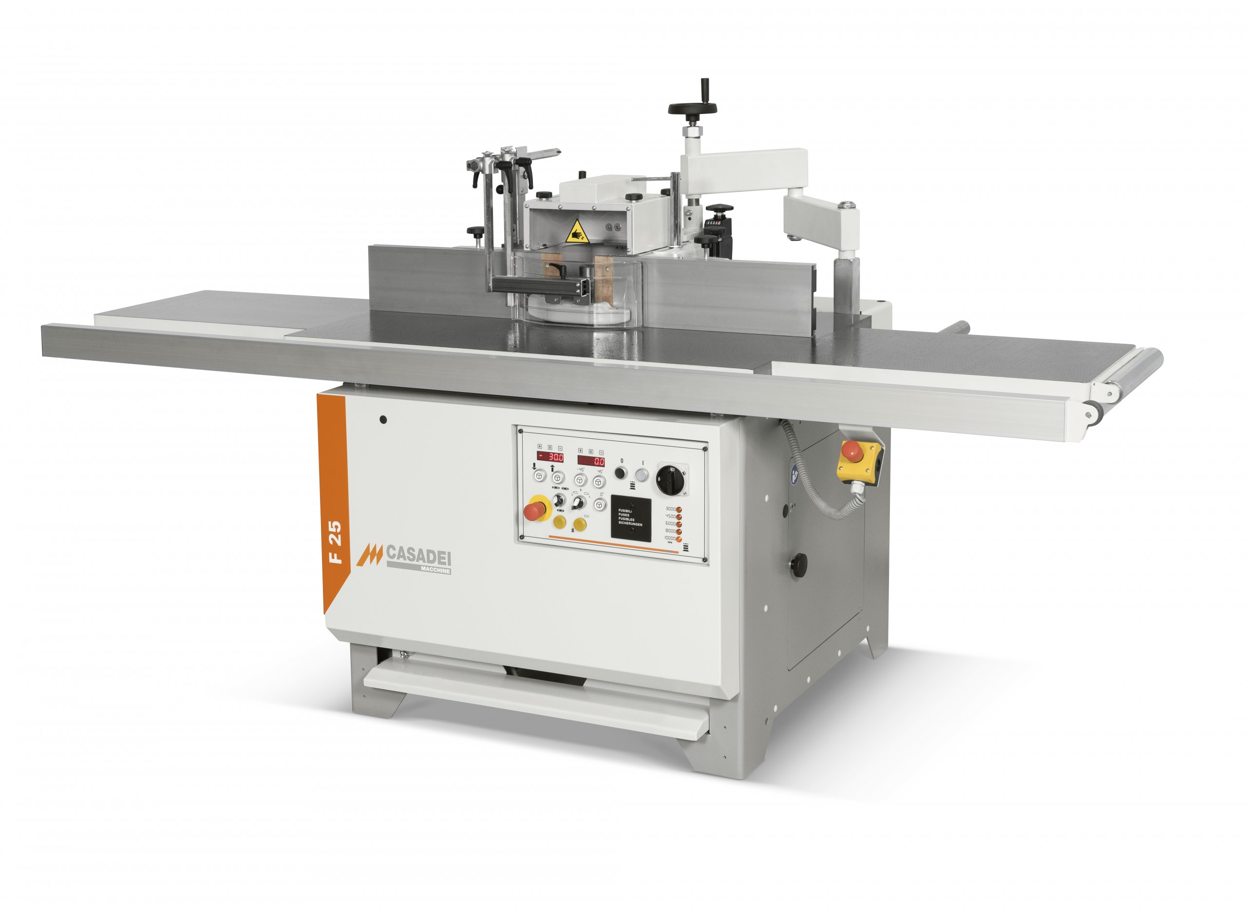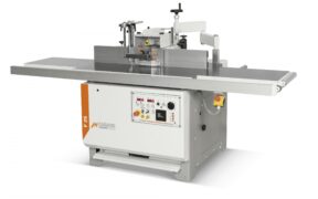 Tafelfreesmachine met schuinverstelbare spindel. De hoogte en de schuinte van de spindel zijn te verstellen door middel van handwielen aan de voorzijde van de machine. Deze machine is optioneel uit te rusten met tafelverlengingen aan beide zijden of met een pennentafel.