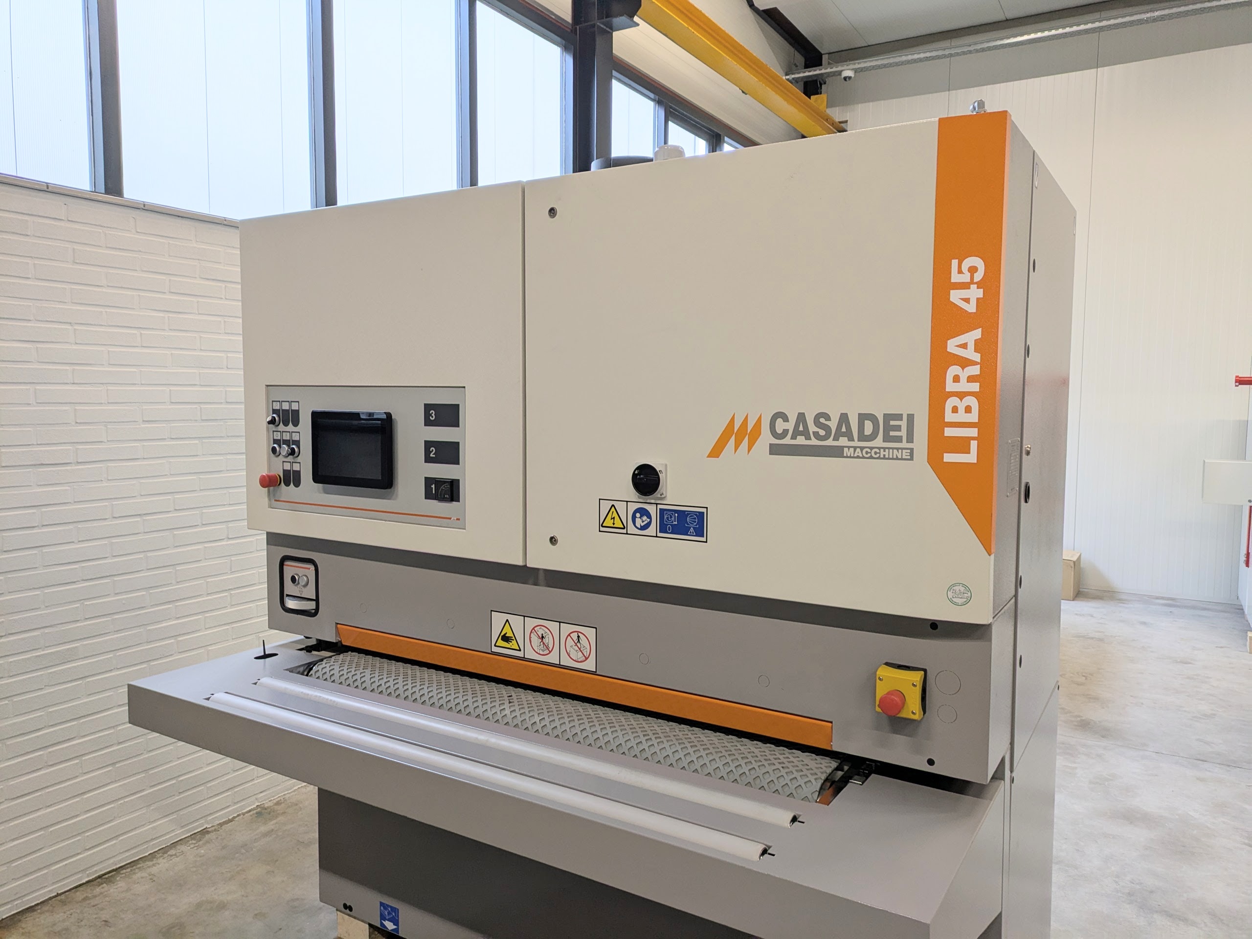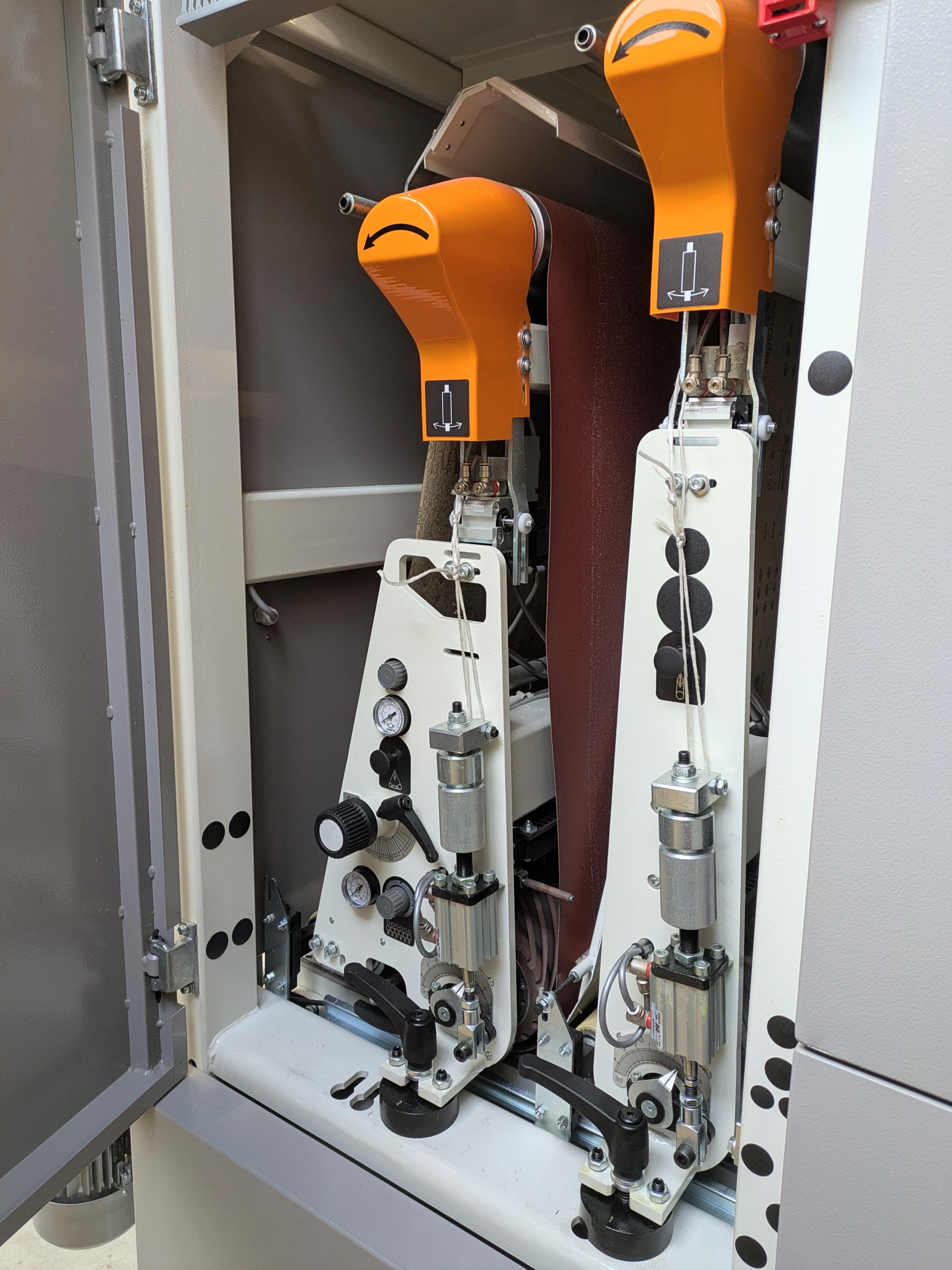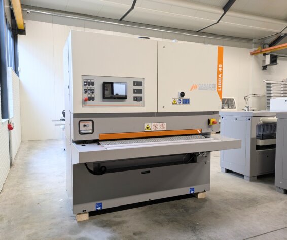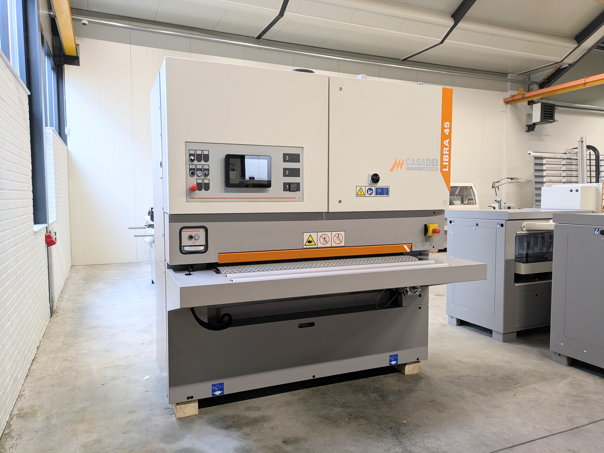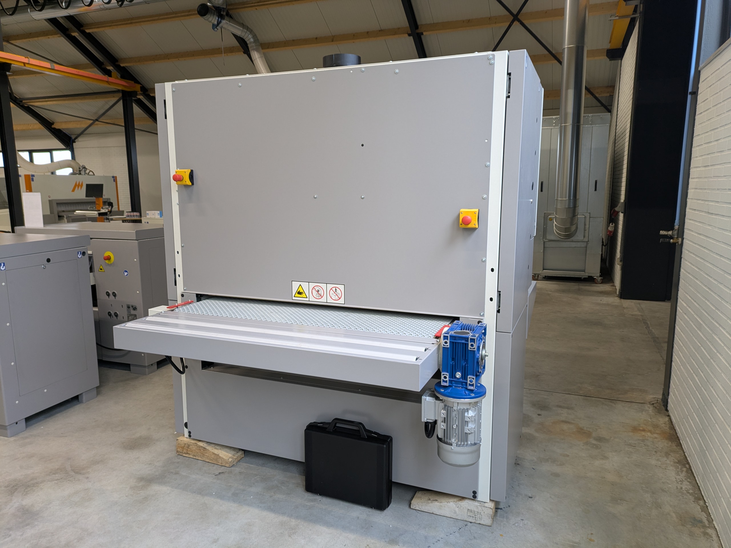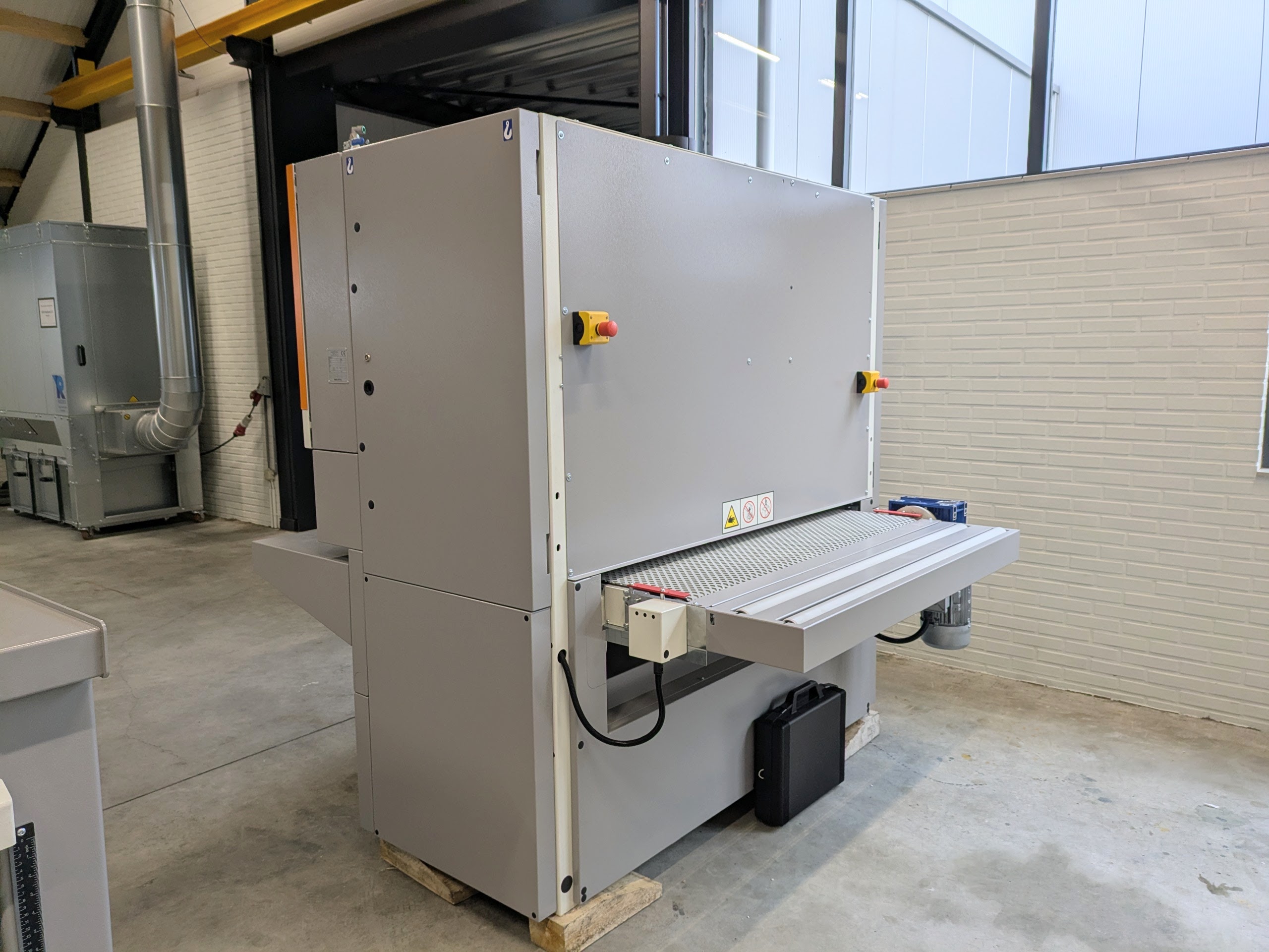 Breedbandschuurmachine met twee schuurunits en digitale hoogteuitlezing. De machine is voorzien van een 10'' touchscreen en heeft een maximale werkbreedte van 1350 mm en een maximale werkhoogte van 170 mm.