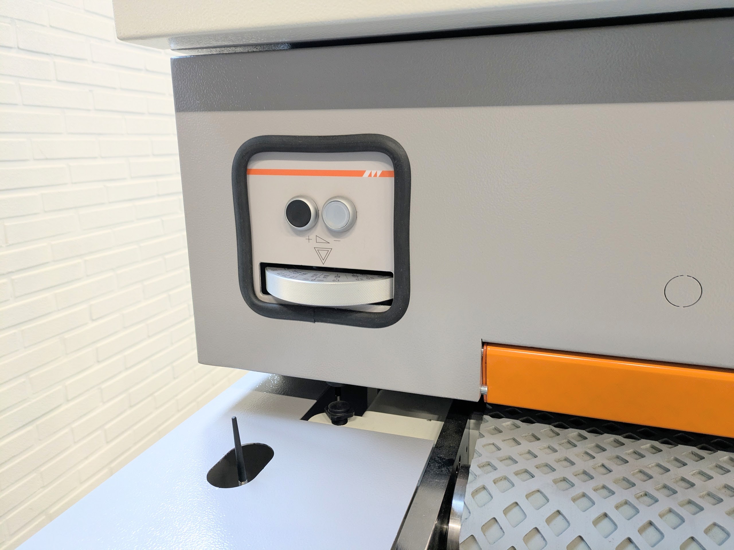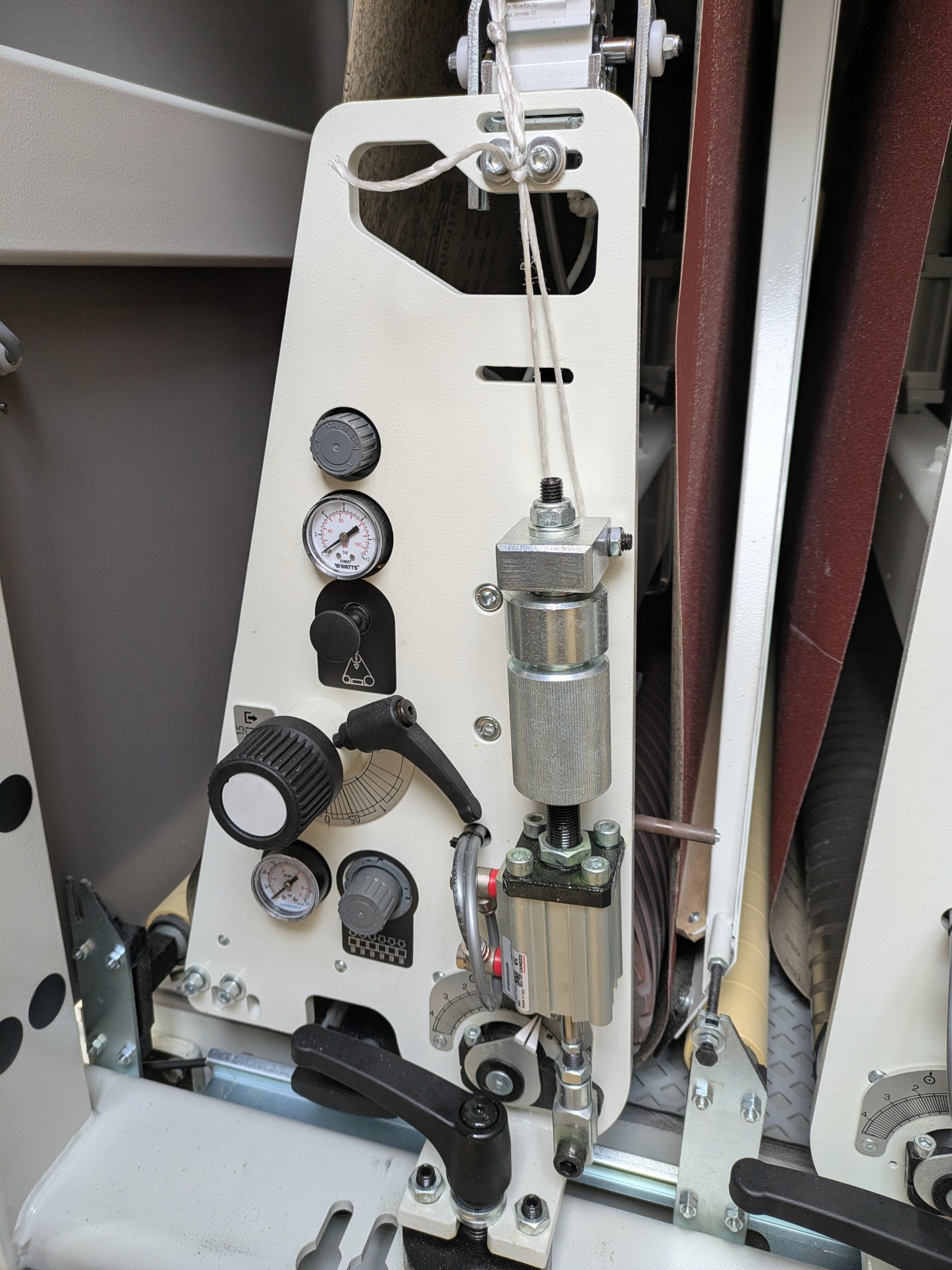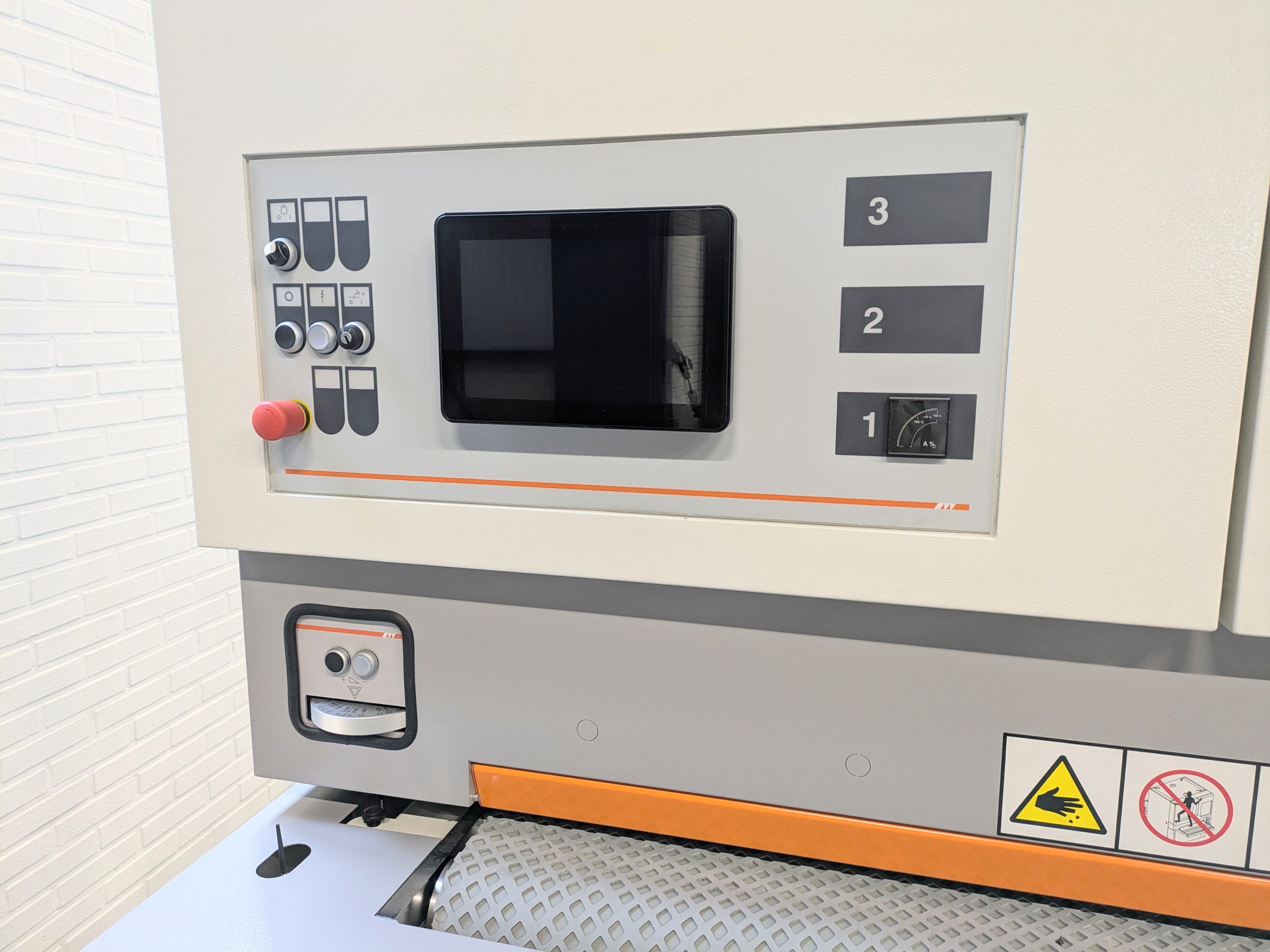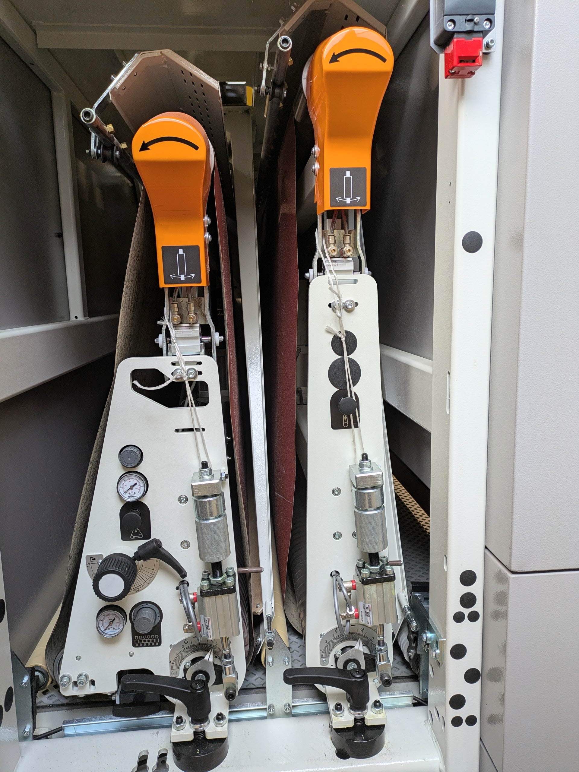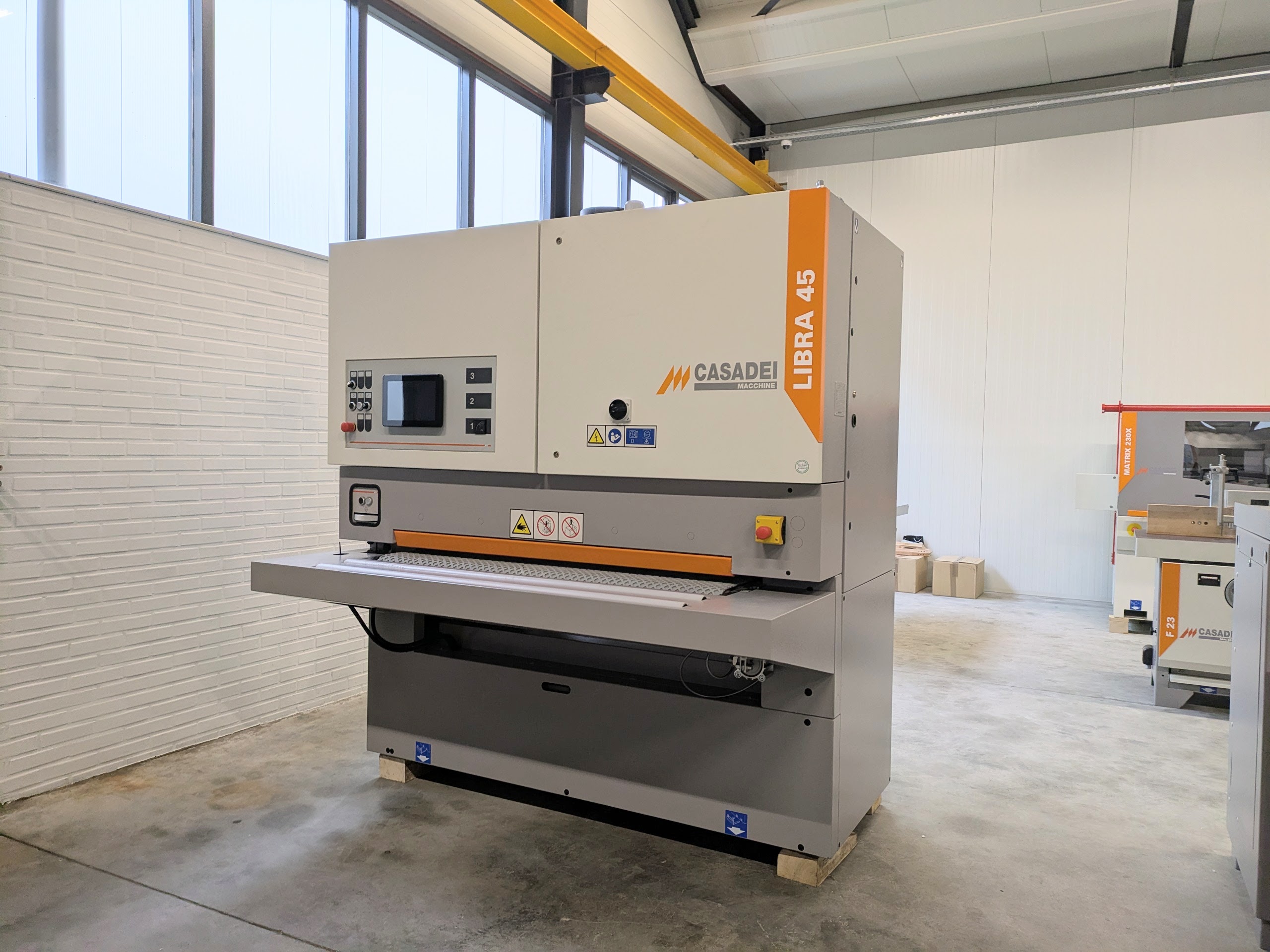 Breedbandschuurmachine met twee schuurunits en digitale hoogteuitlezing. De machine is voorzien van een 10'' touchscreen en heeft een maximale werkbreedte van 1350 mm en een maximale werkhoogte van 170 mm.