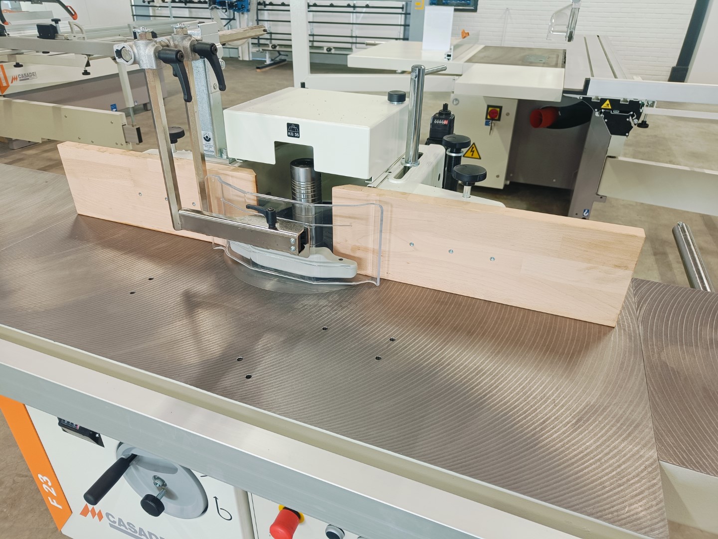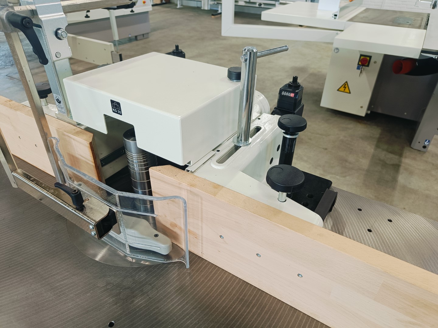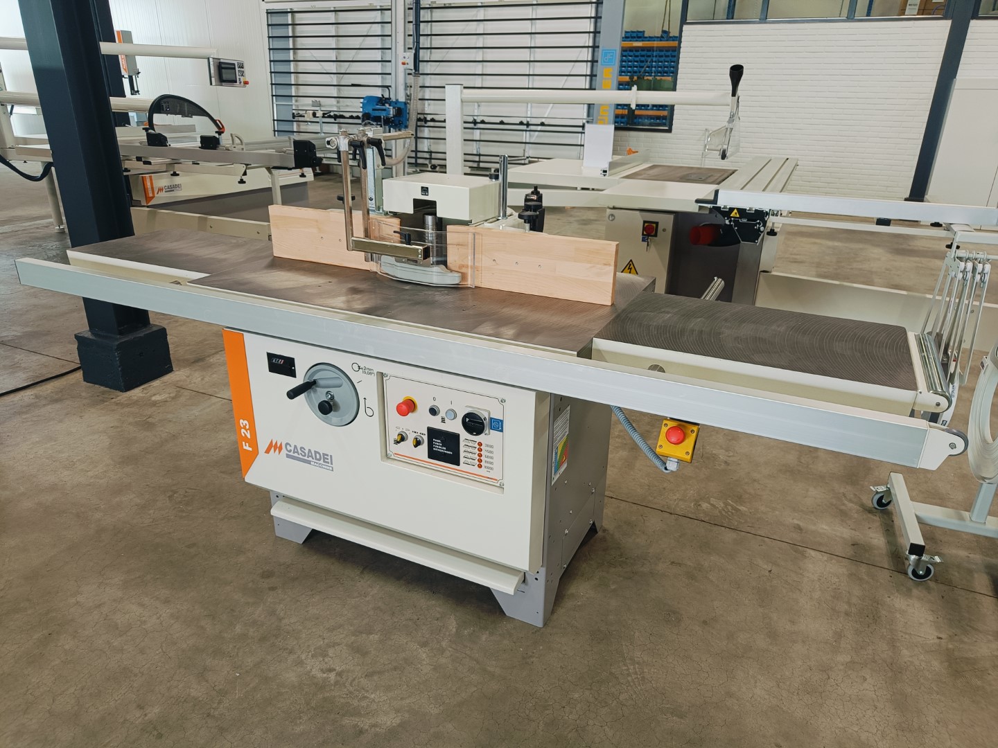 Solide tafelfreesmachine met tafelverlenging links- en rechts, met uittrekbare steun voorzijde. Machine handmatig instelbaar, mechanisch digitaal afleesbaar. Inclusief elektrische voorbereiding voor het doorvoerapparaat. Prijs af Staphorst.