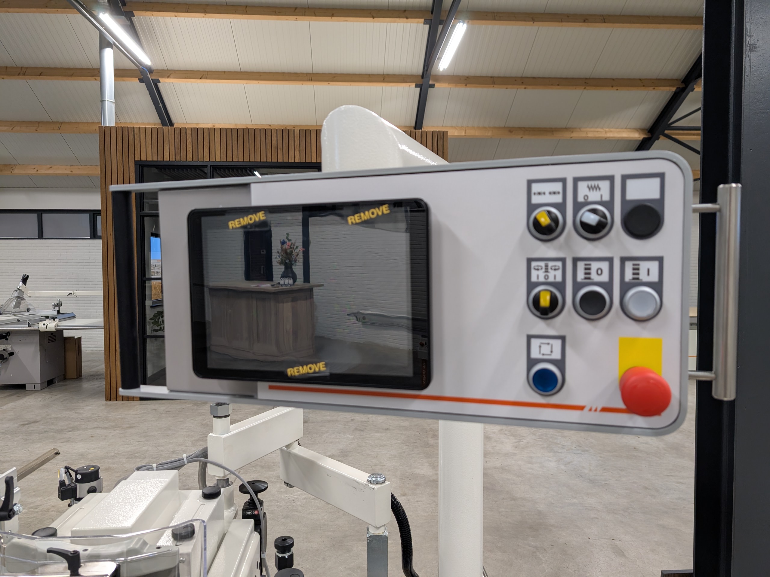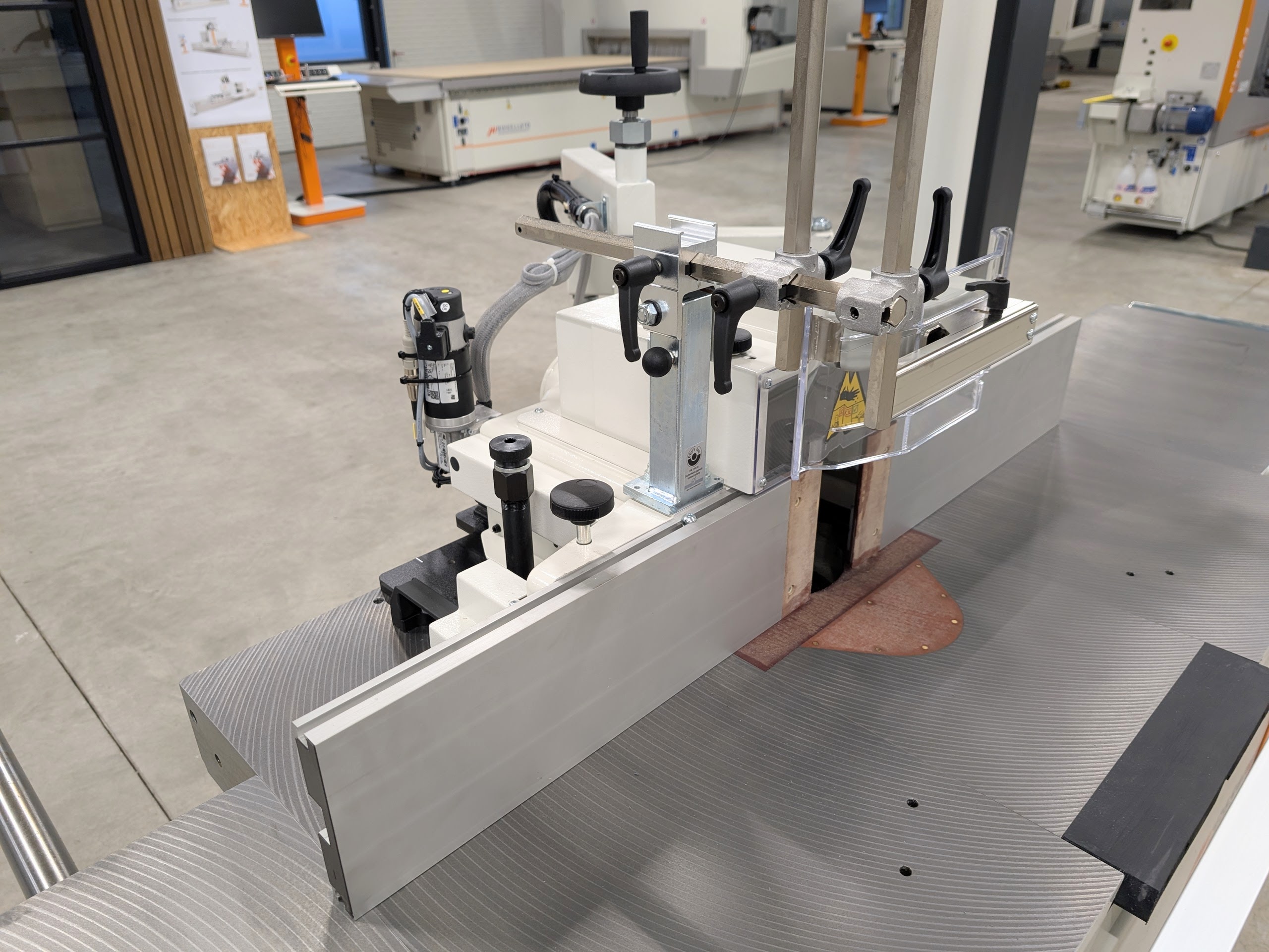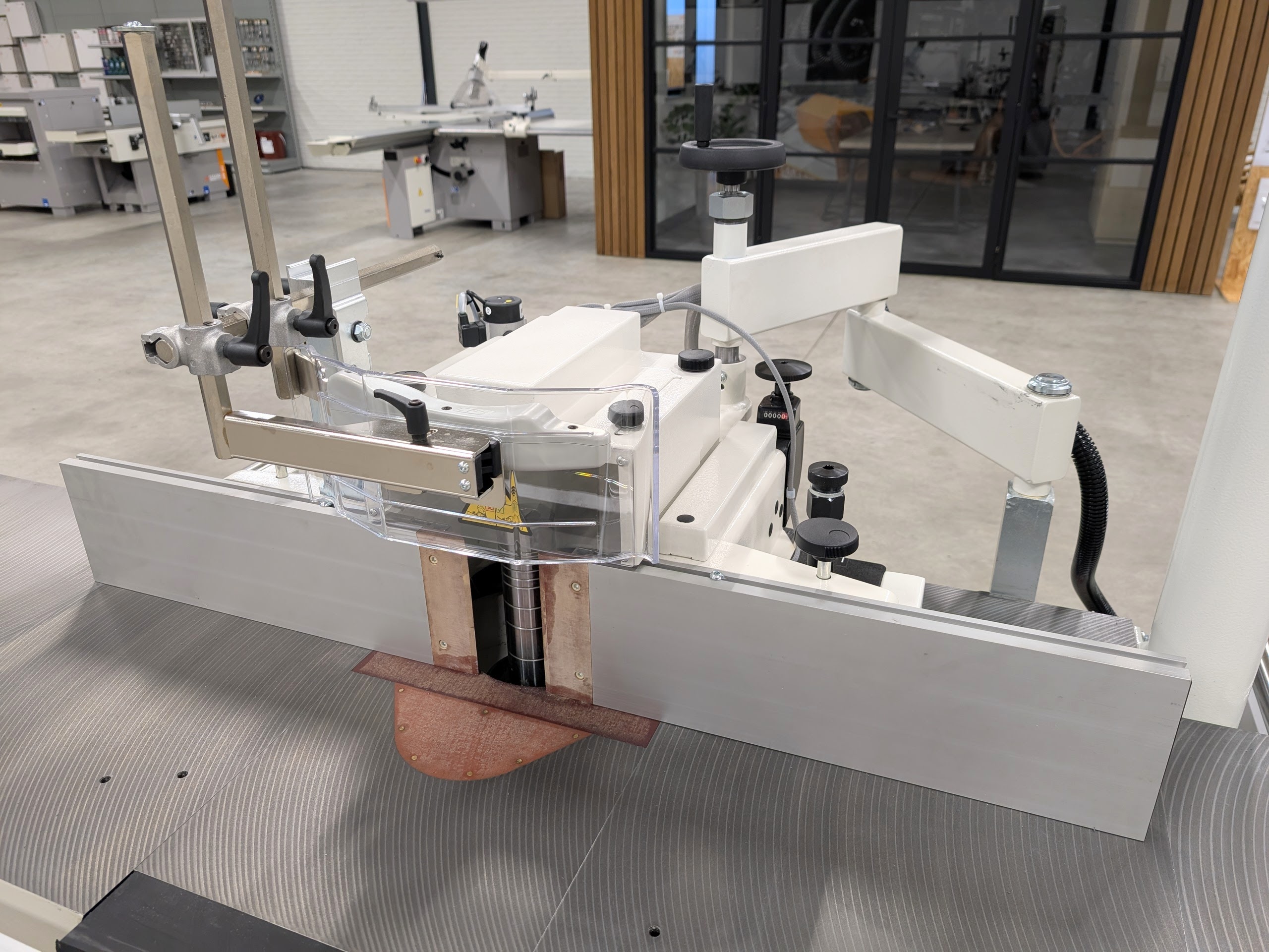Tafelfreesmachine met digitaal besturingspaneel, voorzien van tafelverleningingen en gestuurde freesgeleider.