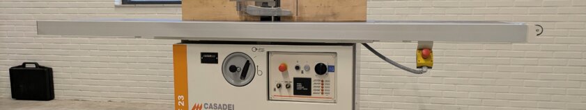 Brede vlakbank van Casadei. Deze vlakbank heeft een elektrische hoogteverstelling met digitale aflezing. Machine heeft een bovenbediening aan de invoerzijde.